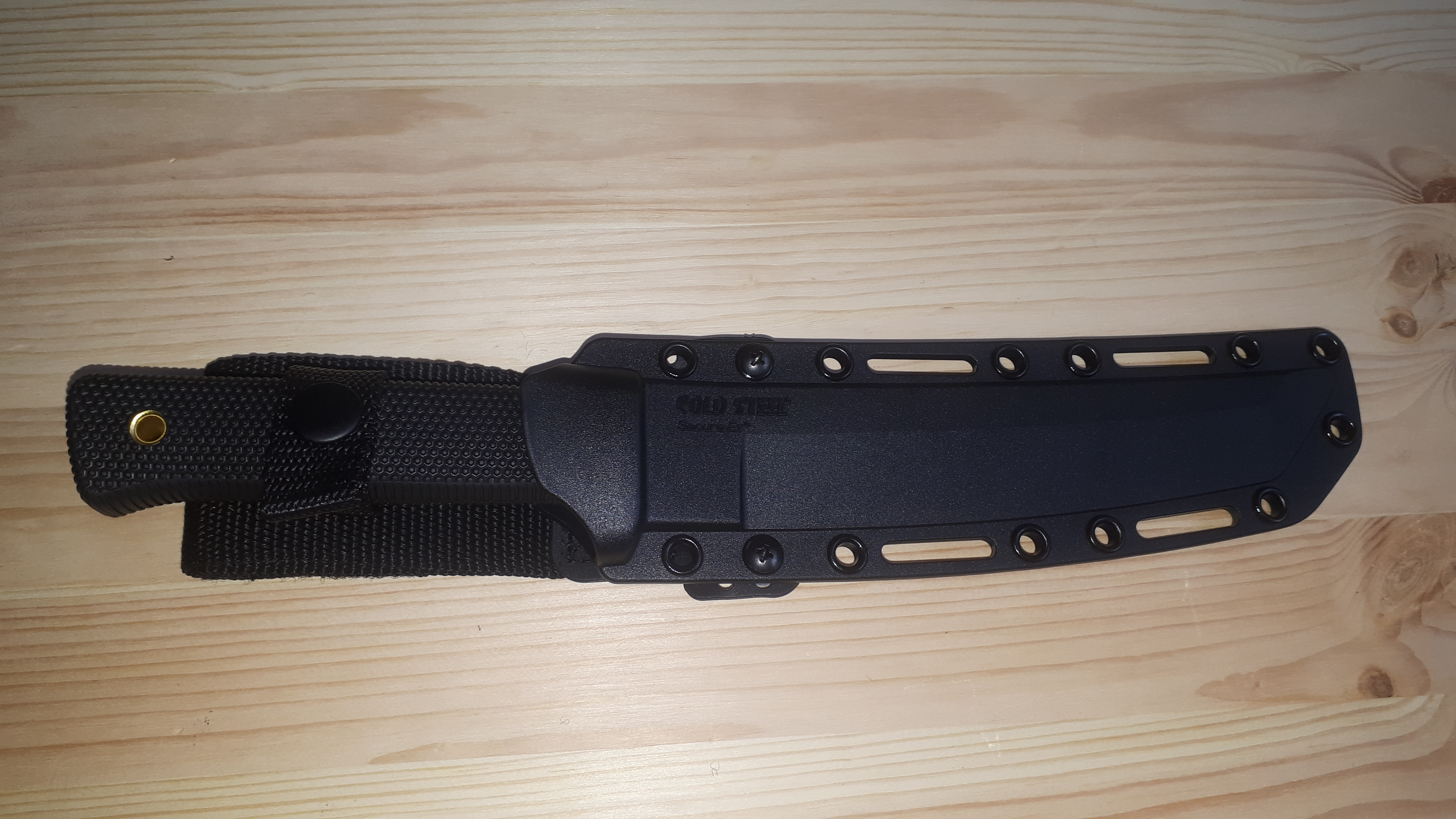 красивый, большой, довольно тяжелый. Ножны переделал под себя под левую руку. Клеймо “cold steel” на ножнах только с одной стороны. На винты капнул фиксатор резьбы.