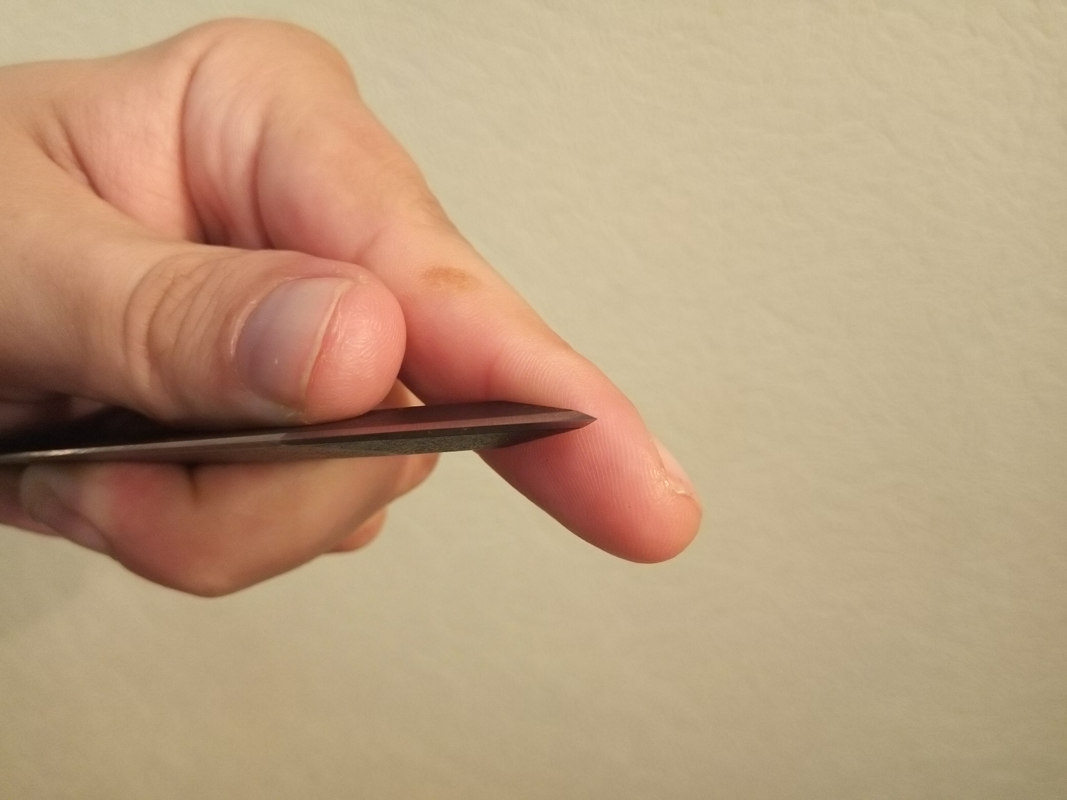 Ну не об этом... Сам клинок сделан очень качественно, никаких неровностей, не к чему даже подкапываться. Лезвие достаточно острое. С бумагой и огурцами справляется на ура. В руке лежит ну о-о-очень удобно. А баланс так вообще отдельная тема. Ну не буду превышать лимит символов, а поэтому скажу просто - баланс на все 6 из 5-ти.