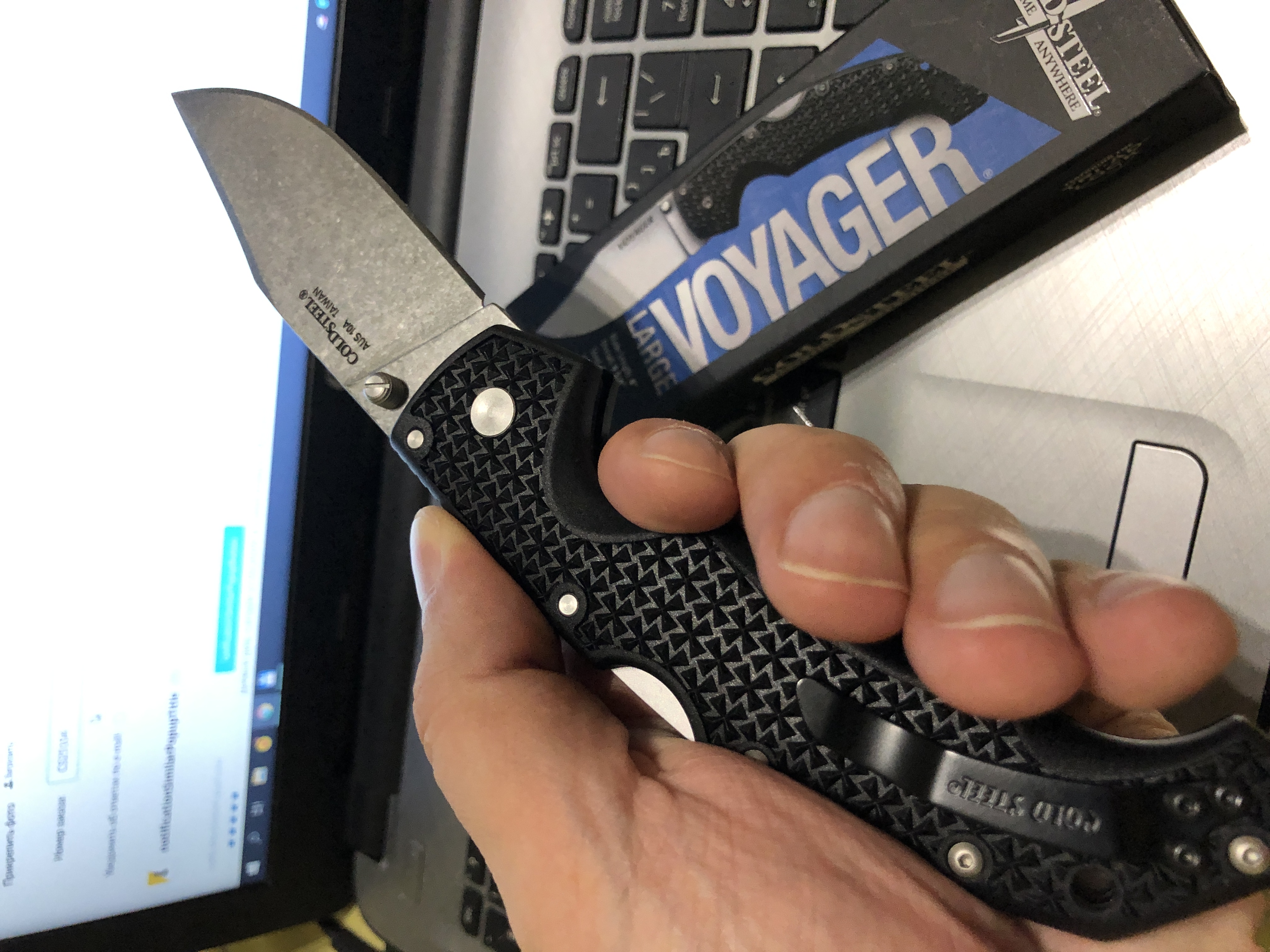 Второй нож фирмы Cold Steel. Первый Ti-Lite 4 каждый день на кармане уже два года - легкий и занимает мало места. На вояджер обратил внимание из-за ухватистой рукояти, резучих спусков от обуха и крепчайшего замка. На тилайте блестящая клипса, тут же клипса черного цвета, что меньше привлекает ненужного внимания. Также клипса ожидаймо тугая, поэтому пришлось немного доработать, что б не спадали штаны,когда крепишь складень на карман. В целом покупкой доволен как автобус.