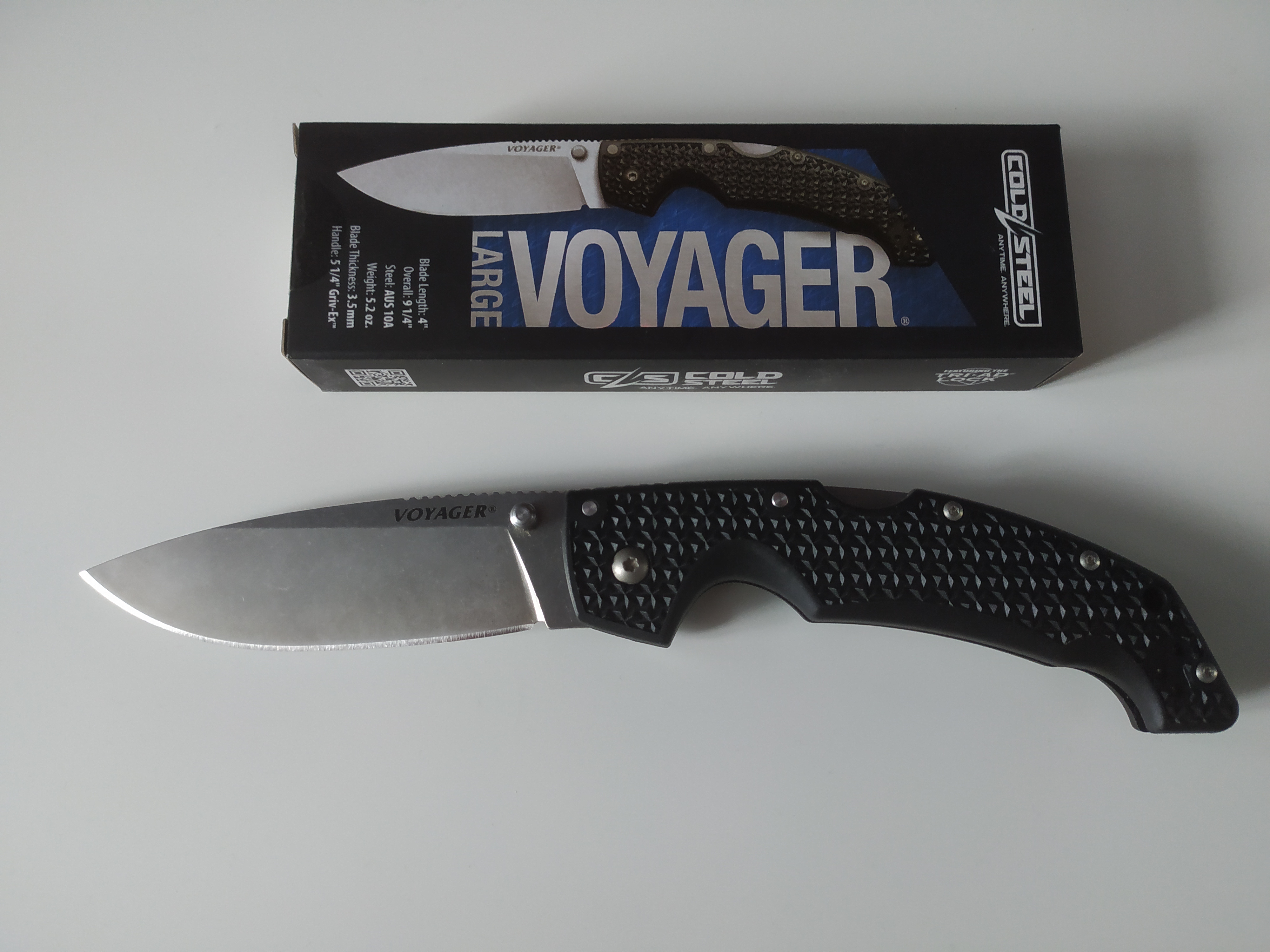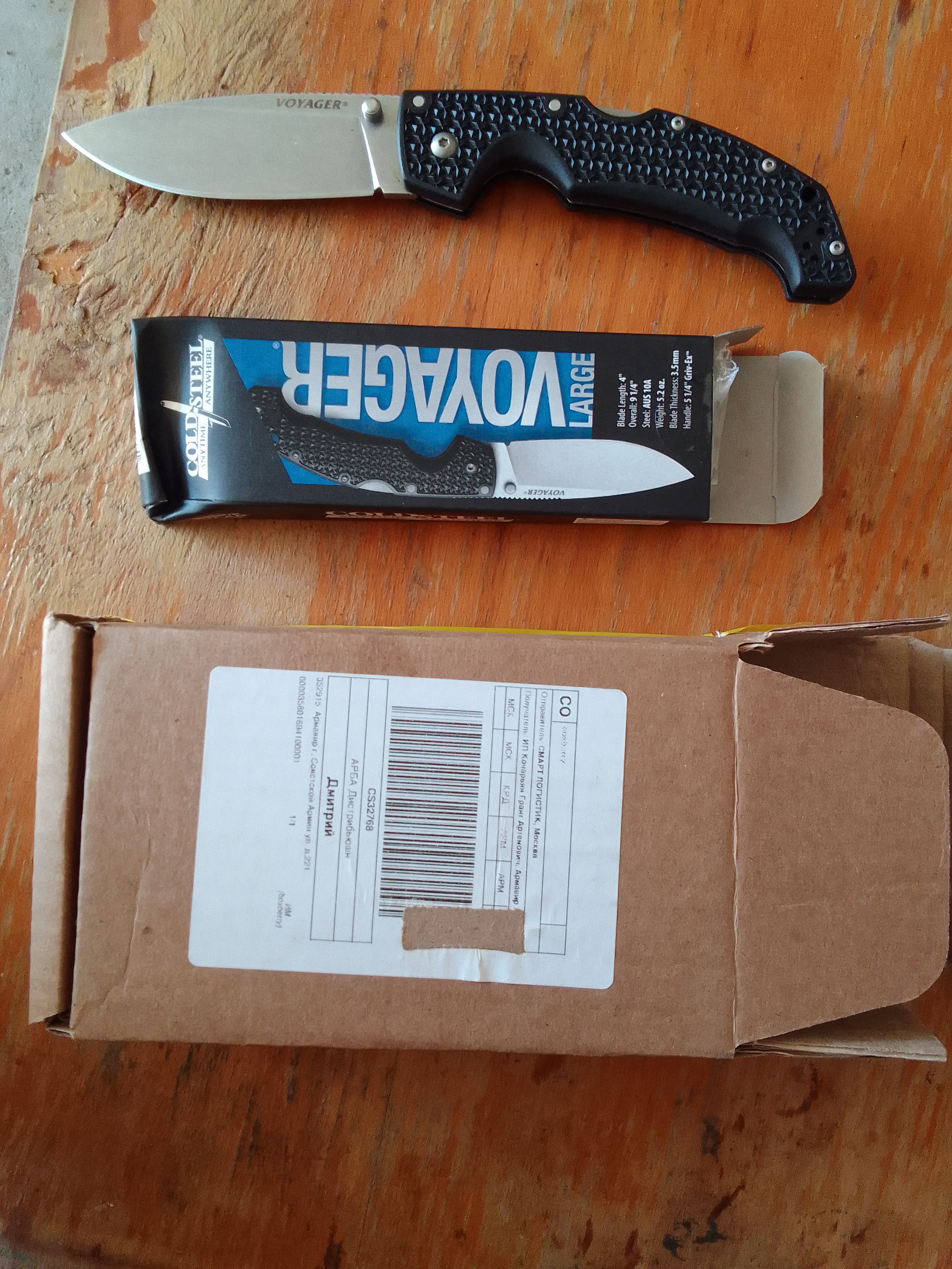 Долго выбирал хороший нож "на всю жизнь". Просто для души, для походов в лес, на природу, не для пробивания капотов и перерубания деревьев :(. Остановился на COLD STEEL VOYAGER LARGE DROP PLAIN. Тем более, что от COLD STEEL уже есть кухонники - филейник, шеф, серейтор. Магазин, учитывая опыт сотрудничества, пошел навстречу, согласовали скидку, поредомендавали в комплект взять масло также от COLD STEEL. Посылка дошла быстро, упаковано, как всегда, на уровне.