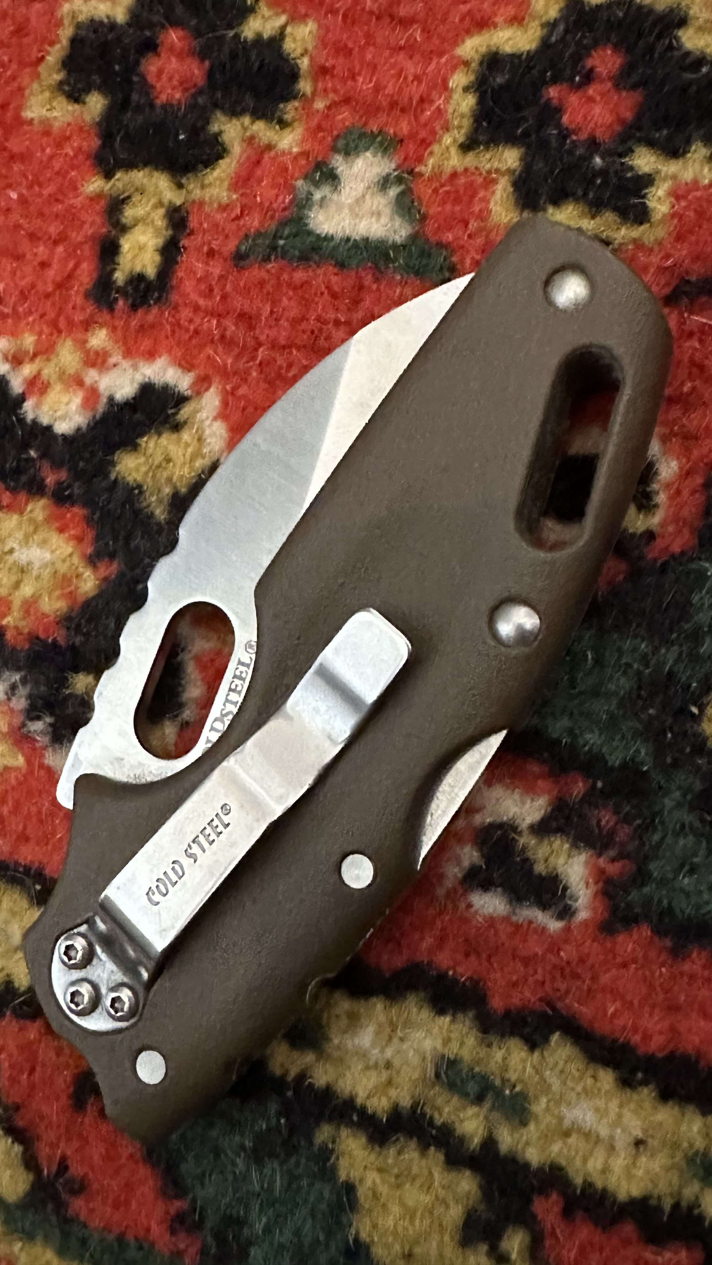 И вот возникла необходимость в приобретении маленького ножа. Попробовал нож от Керши «Шафл 2». Нож оказался совершенно не пригоден для решения моих задач. И я решился на приобретение уродца от Cold Steel)